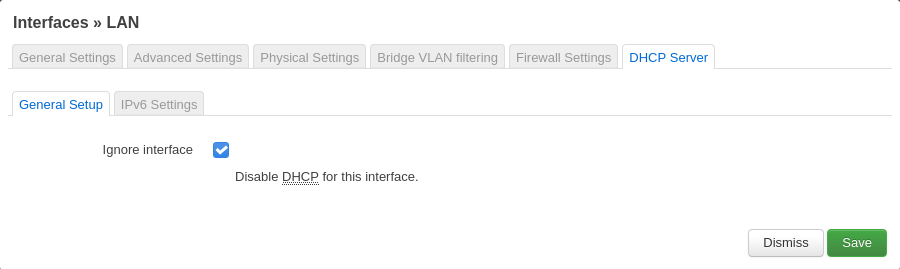 Now click on the DHCP server tab, and in the General Settings subtab select Disable DHCP for this interface. This disables DHCP server on IPv4. Since this is a device in an existing network, the existing router is also the DHCP server.
