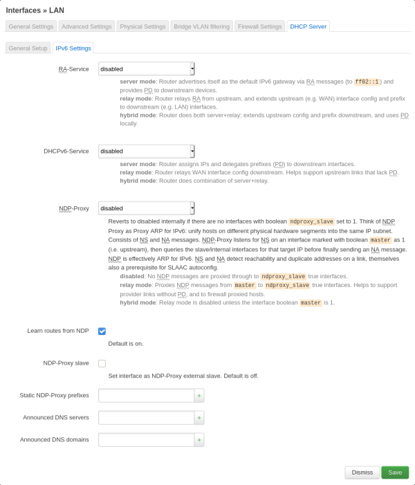 Then click on the IPv6 settings subtab and select “disabled” for RA-service, DHCPv6-service and NDProxy-service. This disables DHCP on IPv6, same reasons as above.