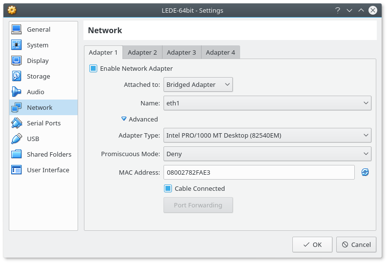 Note that the order of the “Host-only Adapter” as “Adapter 1” and “NAT” as “Adapter 2” is important for turn-key operation of OpenWrt in the VM. While it can be configured using the console, configuration in this way simplifies getting to a running configuration.