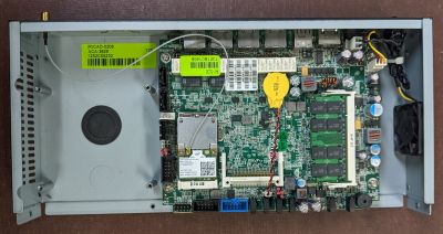 Hardware components include an Intel Atom D510 processor (located on the bottom side of the main board), a stick of RAM (the test unit came with strangely generous 4 GB, so it is possible this was an upgrade done by the previous owner), an Intel 82583V Ethernet controller, and an Intel 6230 Wi-Fi controller. Primary storage can be a CF card (there is a slot for it on the main board) or a SATA drive (there's a set of SATA connectors and a set of standoffs, but a mounting tray may or may not be present).